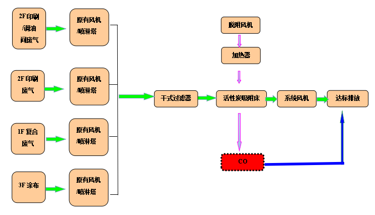 根據(jù)該公司的要求及我司有機(jī)廢氣的治理經(jīng)驗(yàn),采用干式過(guò)濾、活性炭吸附處理有機(jī)廢氣,活性炭吸附飽和以后采用CO催化氧化裝置對(duì)其進(jìn)行脫附。